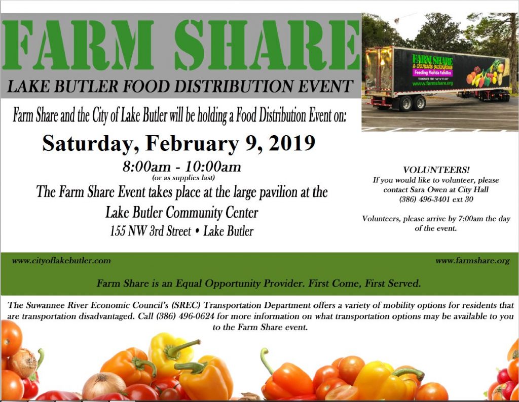 Farm Share and the City of Lake Butler will be holding the February 2019 Food Distribution event on Saturday, February 9, 2019. The distribution will take place from 8:00am – 10:00am at the large pavilion at Lakeside Park, 155 NW 3rd Street.