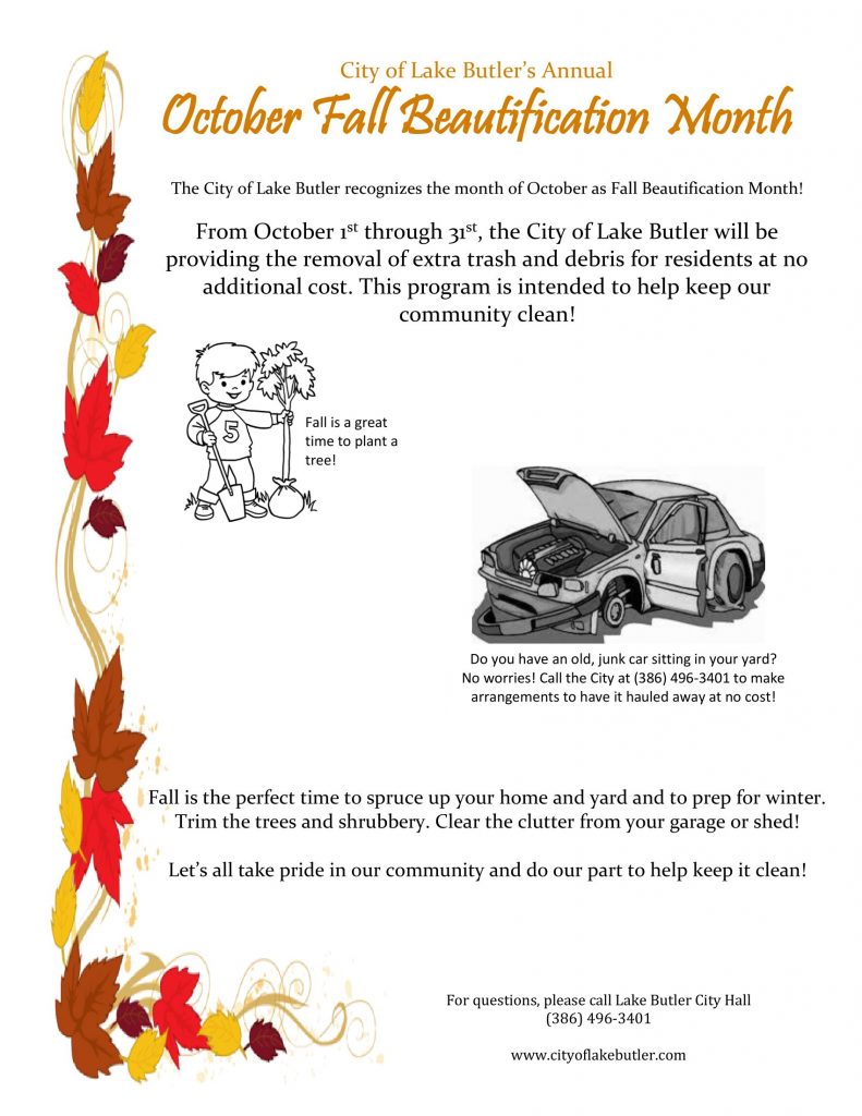 City of Lake Butler Recognizes October as Fall Beautification Month September 26, 2019September 26, 2019 LBCP