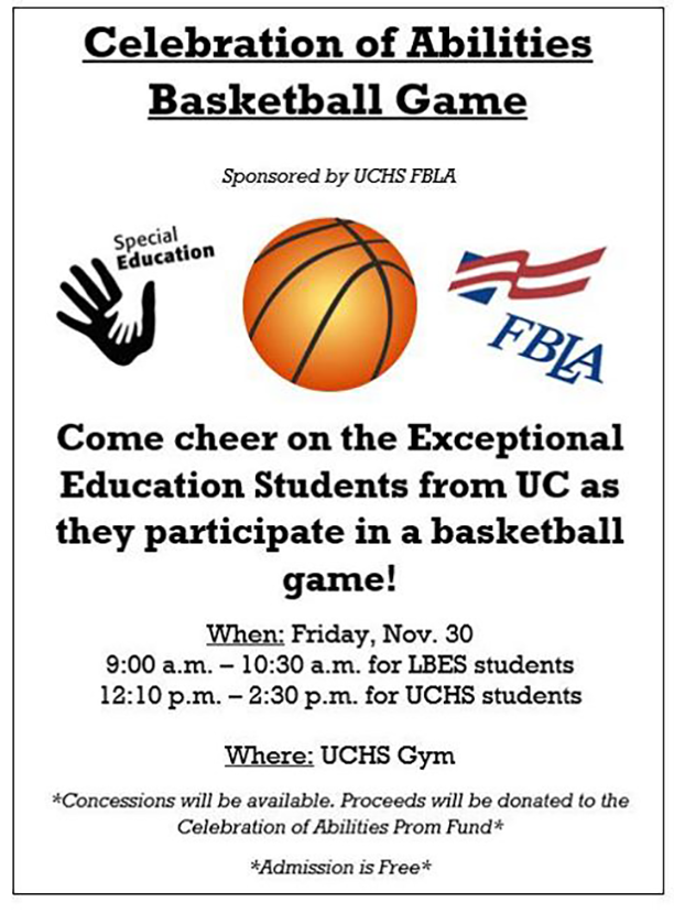 Come out and help cheer on the Exceptional Education Students from Union County as they participate in a basketball game! The event is set for Friday, November 30, 2018 in the Union County High School Gymnasium! Admission is Free! There will be concessions available. Proceeds earned will be donated to the Celebration of Abilities Prom Fund!