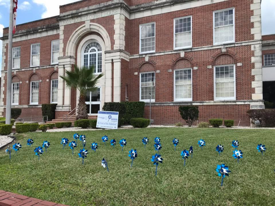 The blue and silver pinwheels represent the happy, healthy childhoods that all children deserve.