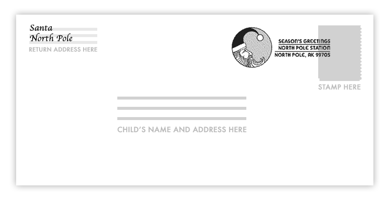 Have your child write their letter to Santa and let them know you will mail it for them. Once you get the letter, write our your reply and slip it into an envelope addressed to your child with the return address of “Santa Claus, North Pole.” Be sure to affix postage, and then place this letter into a larger envelope and mail it to: