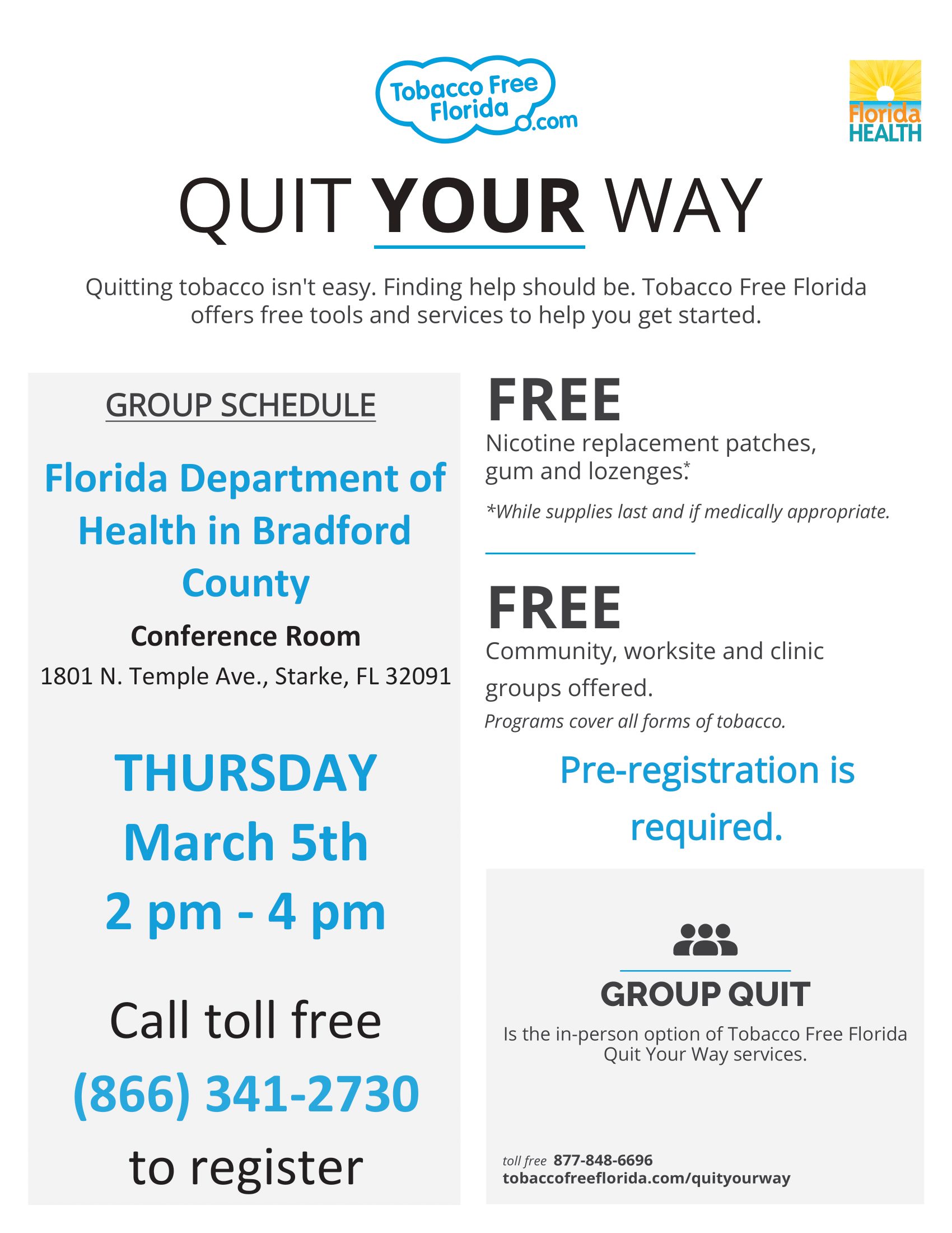 49 thoughts on “Tobacco Free Florida Quit Your Way FREE Program, March 5, 2020, Bradford County Health Department