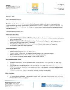 The Union County School District has continued to track updates regarding the Coronavirus (COVID-19) in collaboration with the Florida Department of Health in Union County. In an effort to protect our students and staff, I have directed several actions for the district and schools to decrease the spread of respiratory illnesses like the Coronavirus.