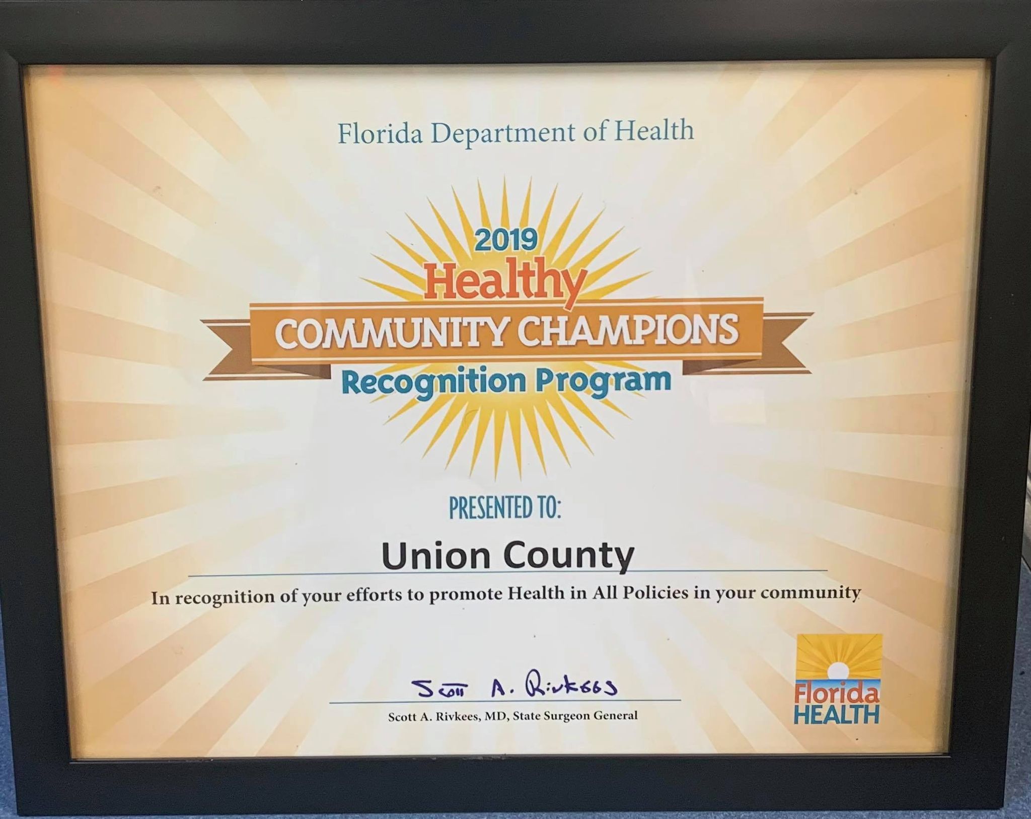 In 2019, The Florida Department of Health recognized 33 communities as the Healthy Community Champions including the City of Lake Butler and Union County. Both municipalities are playing an essential role in improving the health of our community by implementing a variety of policies that have been shown to increase physical activity and improve nutrition. Union County and the City of Lake Butler’s collaborative efforts have helped to provide access to services, facilities, and programs by regularly supporting the prioritization of maintaining walking and biking trails, city and county parks, and local policies that allow zoning for vendors selling fruits and vegetables in the county. Additionally, both agencies work to develop, implement, and promote plans that support free physical activity opportunities for all residents within the county, including those residents that live in low-income areas.