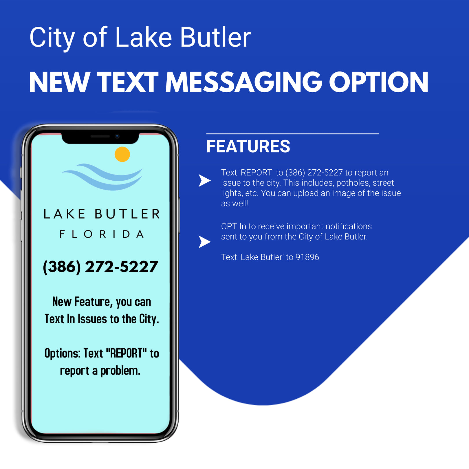 The City of Lake Butler recently launched a new Text Messaging System for the community. The first part of the new system is a feature that allows residents and visitors alike to notify the city of an issue, such as pot hole, street light being out or other miscellaneous issue needed attention. To use this notification system, you can Text the word “Report” to (386) 272-5227. You will receive a response that asks questions to aide you in reporting the issue. As a note, if you snap a photo of the issue, you can include that in your response.